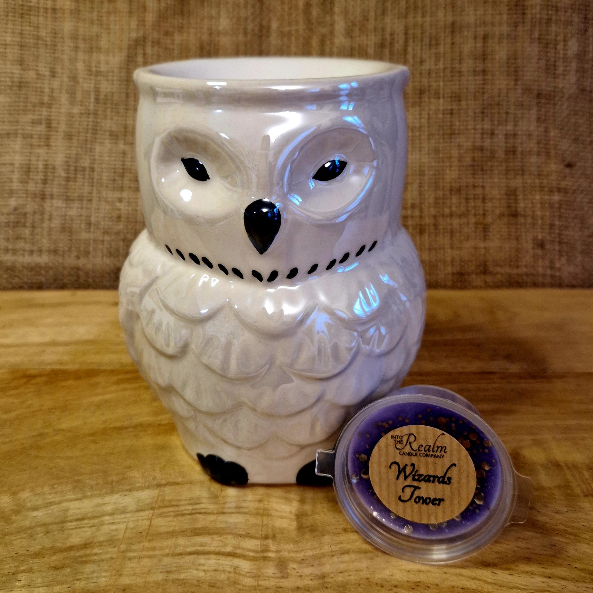 This beautiful burner, reminiscent of a popular wizards owl, features a stunning iridescent glaze. This white owl burner shimmers and shines in the light. The owl is made from painted glossy ceramic and comes packaged in a photo box. The owl has a well on the top of its head for wax/oil and tealight cut-out on the back side. Along with 2 cut-outs for the light to shine through. This is the perfect celestial gift for wizarding fans, or a treat for yourself.