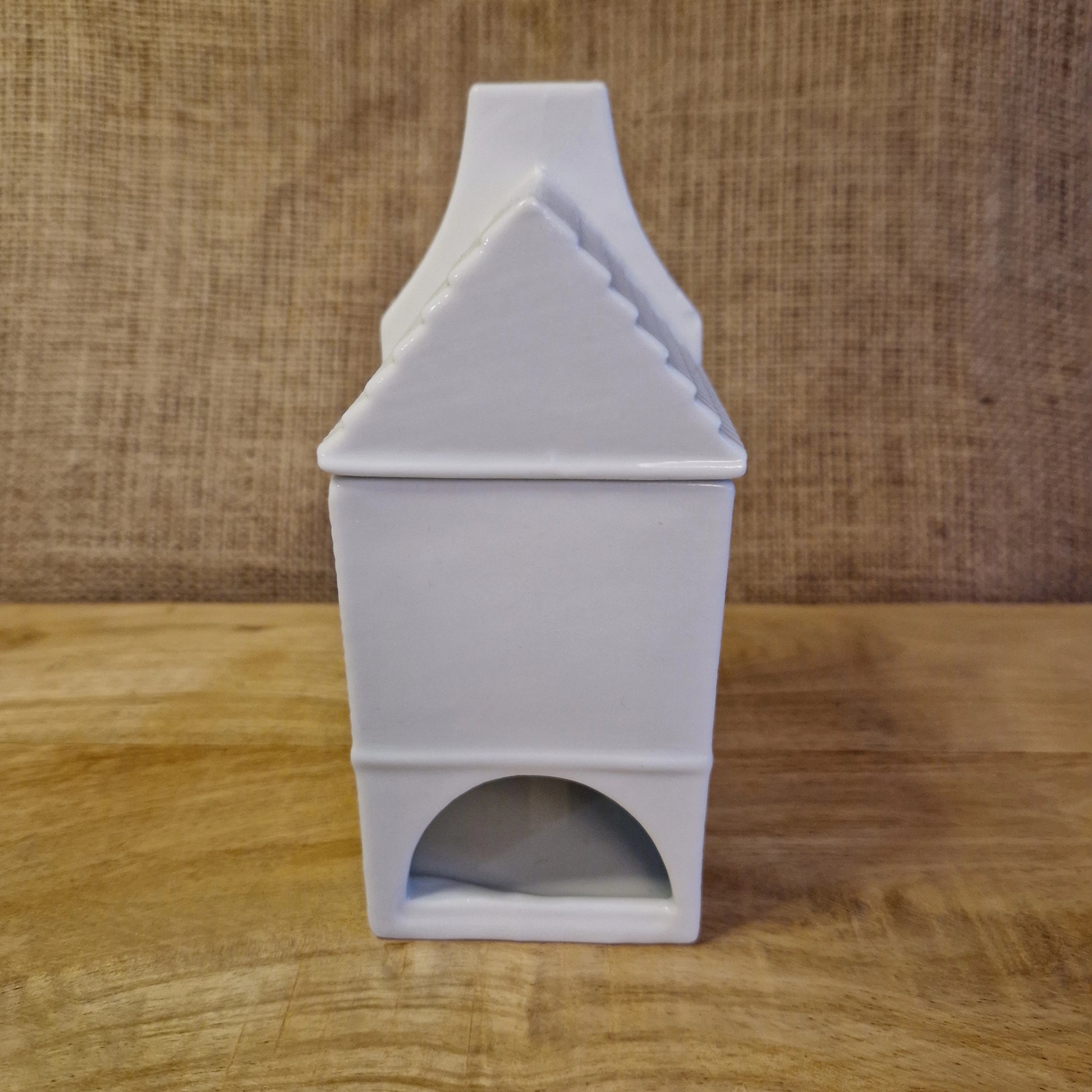 This Nordic-style white house is made of glossy painted ceramic and comes packaged in a photo box. The burner has a beautiful brick texture detail, and features a door and window cut-outs. There is a removable roof, which hides the wax/oil well. Always remove the lid when in use. There is a cut-out on the back side to place a tealight within, which creates a lovely atmosphere as the light glows through the windows.